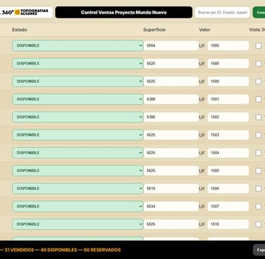 Administra los lotes de tu proyecto desde una plataforma online con acceso privado. El Control de Propiedades te permite actualizar en tiempo real la información comercial de cada lote, manteniendo tu Masterplan 360° y tu página web siempre sincronizados y actualizados.