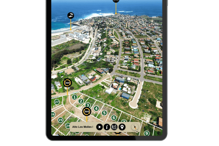 Levantamos el recorrido 360° del terreno e integramos estados y precios por lote, imágenes, videos y documentos descargables. Todo se organiza en una plataforma intuitiva y profesional.